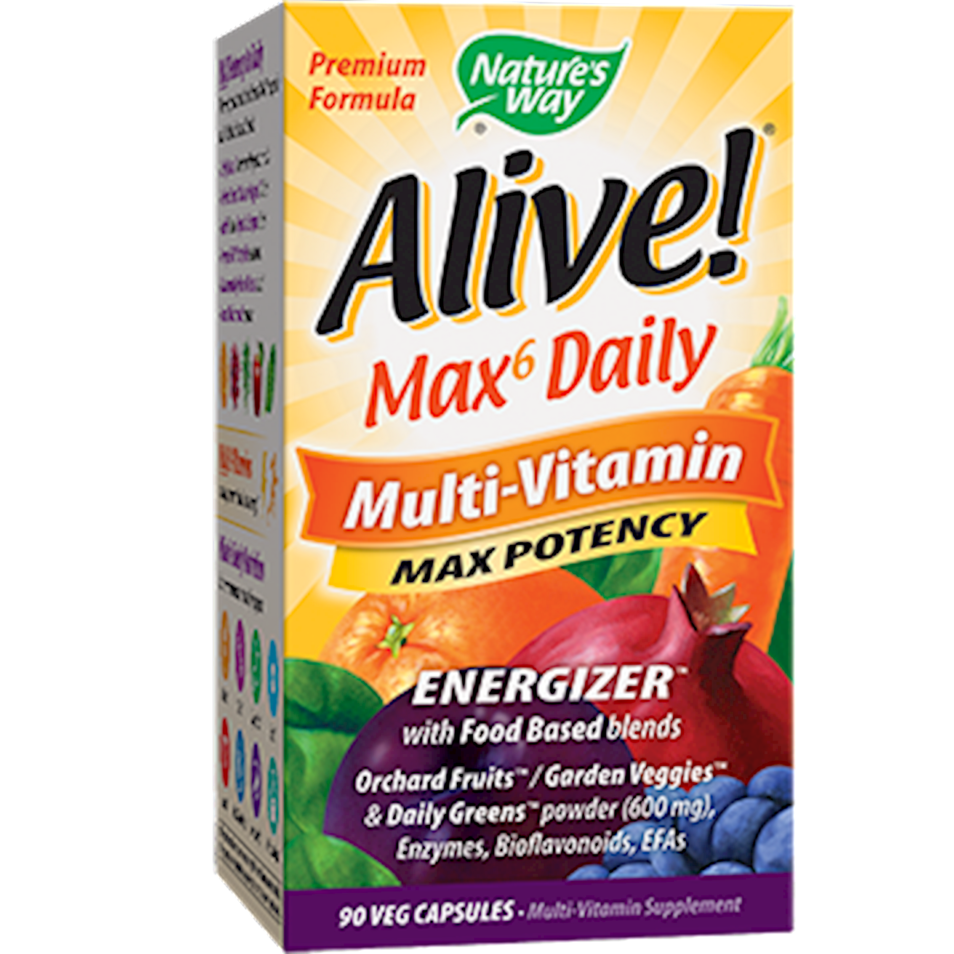 Our original MAX Potency Multi-vitamin Alive! MAX Potency contains a diversity of daily essentials, greens, phytonutrients and antioxidants. This multi-vitamin is made with essential nutrients, botanicals and system defenders including:* 23 vitamins and minerals 12 digestive enzymes 14 greens 12 organically grown mushrooms Antioxidants: Vitamin C, Vitamin E, beta carotene, selenium Its also packed with high potency B-vitamins to help convert food into energy*, Orchard Fruits/ Garden Veggies powder blend (200 mg per serving), and nutrients to help support bone health, daily energy, eye health, heart health, and immune health.*