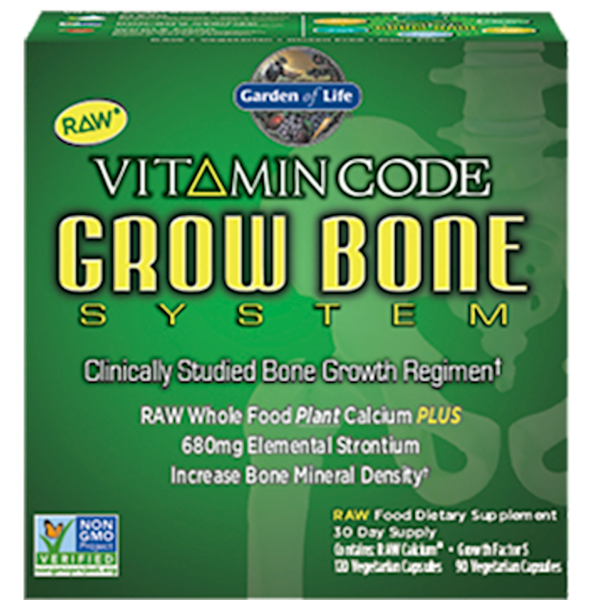 If you are one of the millions of women and men looking to slow normal bone loss that comes with aging, Garden of Life has great news for you. Get ready to experience the Grow Bone System with RAW Calcium and Growth Factor S. The Grow Bone System is intended to stimulate bone growth, increase bone strength and bone mineral density, and has been clinically demonstrated to do so.* Backed by human clinical studies, Garden of Life is confident that the Grow Bone System will help support stronger, healthier bones.* Vitamin Code Grow Bone System includes 756mg of raw whole food plant calcium plus 680mg elemental strontium to increase bone mineral density.* It contains Vitamin Code RAW Calcium, the first RAW whole food plant calcium formula with 1,600IU vitamin D3, RAW MK-7, magnesium and boron that is free from crushed rock, limestone, chalk or animal bones. It also contains Vitamin Code Growth Factor S680mg of elemental strontium, a critical bone-building trace mineral.* Vitamin Code Grow Bone System is a two-part clinically studied system. In a six-month randomized, open label human clinical study, 176 healthy men and women aged 18 to 85 consumed the ingredients in the Vitamin Code Grow Bone System, along with a healthy eating plan and walking program, and experienced a significant increase in bone mineral density as evidenced by comparing their before and after DEXA scans.* The Grow Bone System is based upon the formula that was used in this clinical study. It is made up of two comprehensive, bone-building formulas, Vitamin Code RAW Calcium and Growth Factor S. The Grow Bone System starts with Vitamin Code RAW Calcium formulated with AlgaeCal RAW Clinical Strength. This patented ingredient is an ocean-derived raw, whole food, plant-form of calcium, naturally rich in 73 bone-building minerals and trace elements. In order to maximize the benefits of Vitamin Code RAW Calcium, Garden of Life has added powerful minerals such as raw magnesium and boron.* Finally, live probiotics and enzymes are added to the product as well as raw fruits and vegetables, for what could be the most complete whole-food calcium supplement available today. Free from crushed rock, limestone, chalk and animal bones 1,600 IU Vitamin D3 to help your body absorb calcium efficiently* 100 mcg Vitamin K2 as MK-7 and Magnesium to support proper utilization of calcium in the bone, where you want it most* Live probiotics and enzymes support healthy digestion*