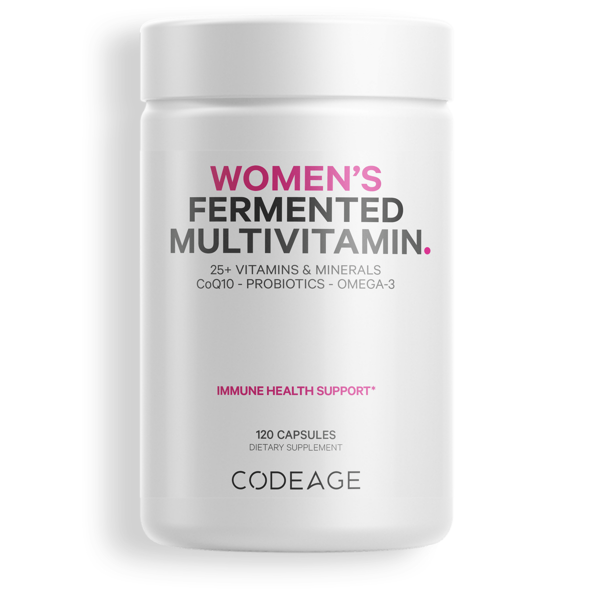 Codeage Women's Daily Multivitamin is a comprehensive all-in-one capsule formula that offers 25+ essential daily vitamins and minerals for women of all ages. It contains a blend of real whole foods vitamins, probiotics, enzymes, organic veggies, fruits, and herbs to help support the immune system and overall health.*